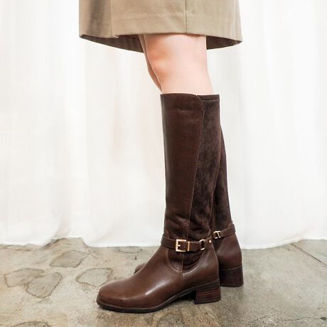 高見えするレザーのロングブーツは履き心地にもこだわりました。シャフトの後ろ半分をやわらかなストレッチ材にすることで足あたりがよく、足も動かしやすくなっています。また、足のラインに沿ってフィットするので、シルエットがきれいに。細見え効果も高く、楽して美脚に♪