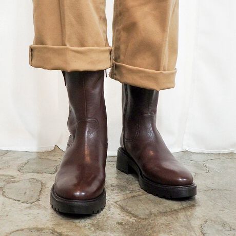 ワークブーツの代表格“ペコスブーツ”をすっきりフォルムでモダンに仕上げ、大人が使えるようデザインしました。光沢あるレザーが足元に高級感をプラス。これ一足でコーデが高見えします。