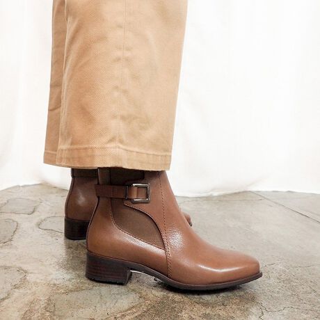カジュアルなサイドゴアブーツにベルトをプラスし、きちんとした印象に仕上げたショートブーツ。