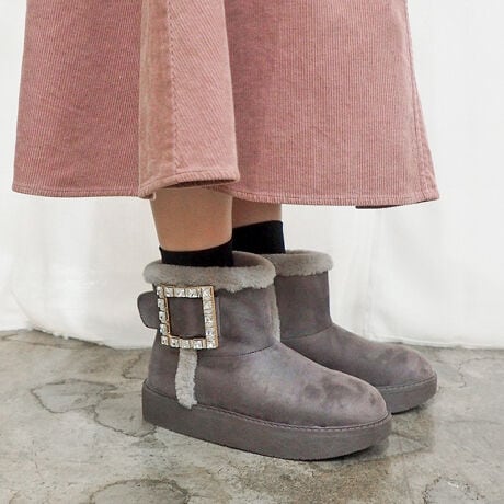 大きなビジューバックルが目を惹く、ラグジュアリーなムートンブーツ。今っぽいくすみカラーで定番ムートンをブラッシュアップ! この一足で一気にいまどきのスタイルに。ブランドオリジナルの厚底ソールでスタイルアップも叶います。