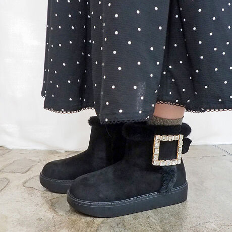 大きなビジューバックルが目を惹く、ラグジュアリーなムートンブーツ。今っぽいくすみカラーで定番ムートンをブラッシュアップ! この一足で一気にいまどきのスタイルに。ブランドオリジナルの厚底ソールでスタイルアップも叶います。