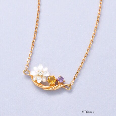 繊細に仕上げられたお花のシェルやシトリン(11月誕生石)、アメジスト(2月誕生石)で街を楽しむラプンツェルをイメージ。アクセントに輝く透明石で、新しい世界にときめく心を表現しています。