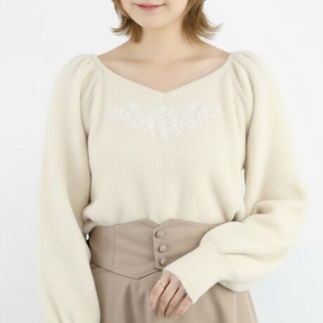 レースのような繊細な刺繍がフロントにあしらわれたニットプルオーバー。