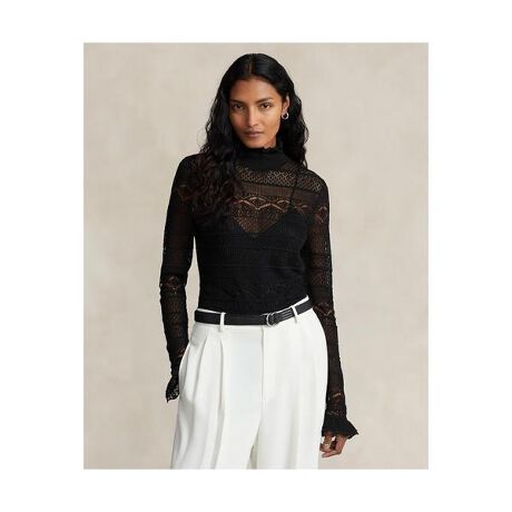 フリルトリムと軽やかなポインテール編みのステッチによるストライプ柄の幾何学模様のレースが際立つスリムフィットのトップス。・スリムフィット / 腰丈・ハイネックにフリルトリム / 首の後ろに4つボタン留め・長袖 / カフスにフリルトリム・全体にポインテール編み・リブニットの裾・モデル身長178cm、着用サイズS※注意:柄の配置は、商品によって異なります。 【素材】・本体:レーヨン 75%、ポリエステル 25%【生産国】中国