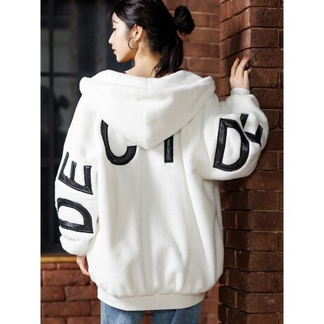 袖から背中にかけて施されたロゴデザインがクールに映えるファーブルゾン。