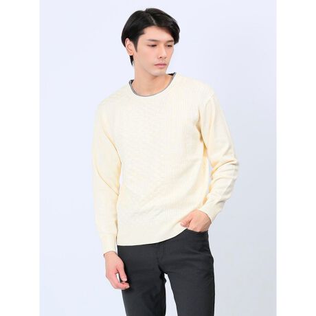 レイヤード風のクルーネックがアクセントになったニットプルオーバーです。前身頃のケーブル&ブロックチェックの編地で、柄の奥行きや自然な立体感を表現しています。(袖と後身頃は無地の天竺編みです。)秋はカットソーや布帛シャツとの重ね着に、冬はインナーとアウターの中間着として防寒対策にマストなアイテムです。
