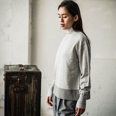 センターに編地でアクセントを付けて、さりげなく着映えるハイゲージニットに仕上げました。