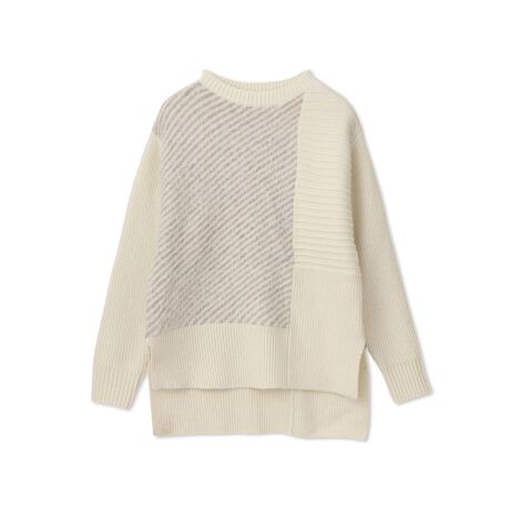 大人も取り入れやすい遊び心あるブロッキングニットプルオーバー。