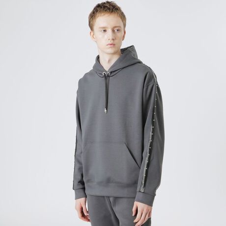 シンセティックレザーにランポーニスタッズを打ち込んだテープをサイドに配したダンボールフーディ