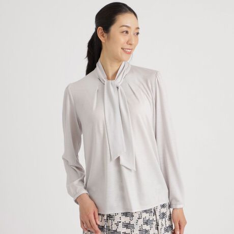 <ジャケットのインナーにおすすめの、ブラウス風ボウタイ付きカットソー>