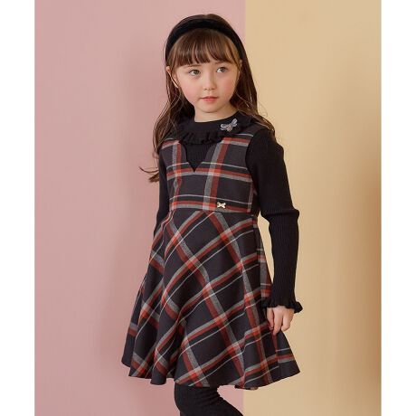 大きめチェックのジャンパースカート。胸元のスカラップデザインがオシャレなポイントです♪上半身はフィット、スカート部分はフレアなシルエットなので、上品な印象に仕上がります。お出かけコーデのマストアイテムです。オレンジ系(#520)のみ、ママとお揃いデザインなので、チェックのリンクコーデをすれば秋らしさ全開!(レディースアイテムはこちら)