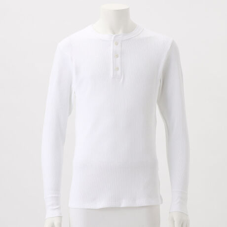 環境に配慮して生産されたサステナブルなアメリカ綿「コットンUSA」を100%使用したBEEFY?(ビーフィー)のコンセプトを体現するタフなサーマルヘンリーネックロングスリーブです。スパンデックス混のヘビーウェイトなワッフル生地を使用し、ネックはバインダー仕様。繰り返しの洗濯でも首周りが伸びにくく、型くずれしにくい耐久性が魅力。脇、袖下部分にフラットシーマ縫製を採用し、より肌当たりがない着心地の良さを追求しました。身体にフィットするシルエットと、優れたストレッチ性による心地良いフィット感も特長です。