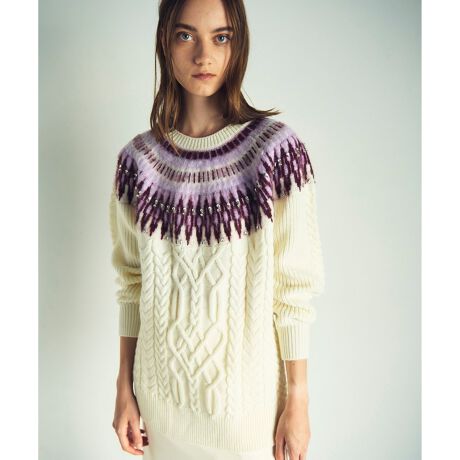 起毛したフェアアイル柄を編み描いたニットプルオーバートップス。