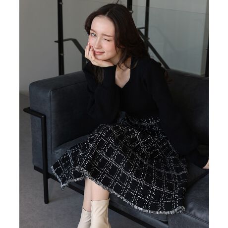 スカート部分にはスタイル良く見えるように拘った、裾に向かって柄が細かくなる縦長のチェック柄を編み立てました。