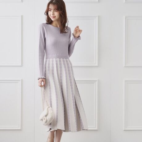 ウエスト切り替えの配色デザインが華やかなニットワンピース