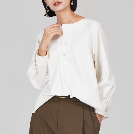 ハリ感とやや厚手の生地を使用し、秋冬も着られる1枚に仕上げました。