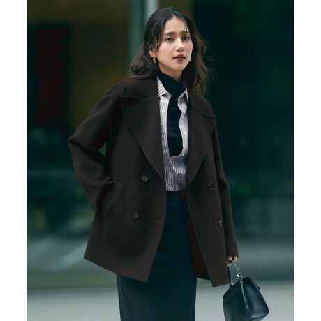 ■デザイン昨年好評だったヒップが隠れるミドル丈のPコートが再登場!今シーズンは上襟とラペルを大きくし、こなれ感はもちろん、小顔効果も期待できるデザインに仕上げました。ミドル丈で作っているので、スカートでもパンツでもバランス良く合わせられます。Pコートならではの細部にこだわったディテールが特徴で、リバー仕立てならではの高級感、軽さもポイントです。
