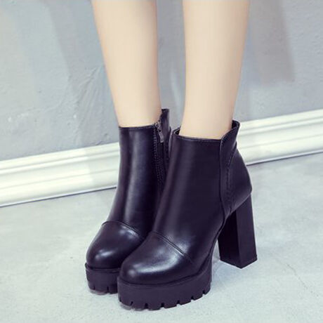 ベーシックなデザインが人気の秘密、サイドファスナー付きチャンキーヒールブーツ