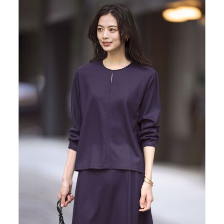 後ろのペプラムデザインがポイントの、程よいタックスリーブがフェミニンなカットソー。スリットネックには滑り止め付きのホックが付いており、留めるとクルーネックに、開けるとキザミ襟になる2way仕様です。パンツとスカートのどちらにも合わせやすく、デイリーにもオフィスにも着回しやすい万能アイテム。同素材のスカートとの着合わせで、ワンピース風にもアレンジできます。
