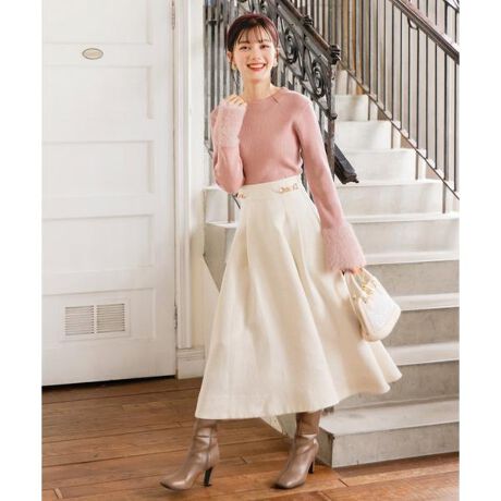 上品なラメツイードが存在感たっぷりなラメツイードビット付きスカート【Design】・ウエストのビットがポイントの華やかさ溢れるスカート。・バックウエスト部分はゴム仕様なので、お好みに合わせてウエストラインを作ることが出来ます。・動く度にゆらゆらと揺れるフレアシルエットが上品な華やかさをプラス♪・ウエストにビットがついているため、トップスをインしたコーディネートがオススメ♪・左ファスナー仕様。【Fabic】・程よい厚みのあるポリエステルのツイード生地を使用。・スムースな裏地付き。・ホワイト、ピンク、ラベンダーの3色展開となります。【Care】ドライクリーニング