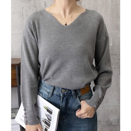 ネックラインスリットと袖にボタンをあしらった大人っぽい韓国風ニットトップス