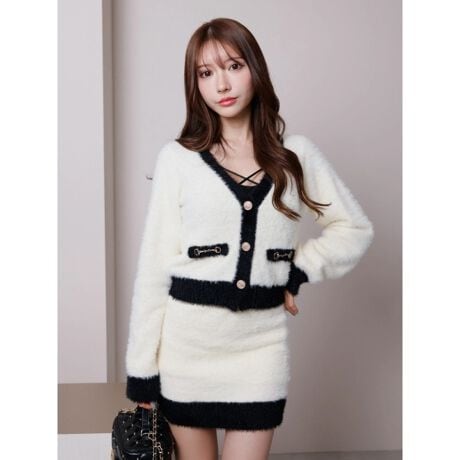 ふんわりとしたフェザーニットで、女性らしい印象に仕上げたセットアップ。