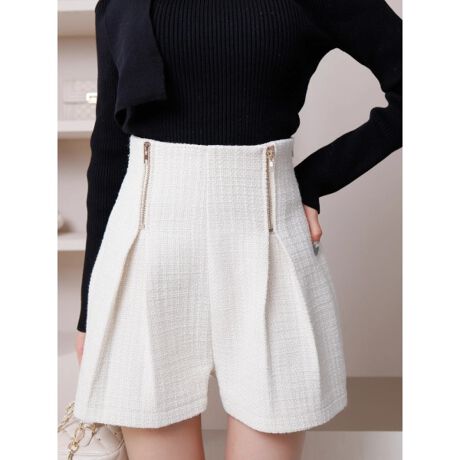 [型番:000436300020]フロントのダブルZIPがアクセントをプラスするショートパンツ。立体的なタックとフレアなシルエットで、女性らしい印象を演出。さりげなく華奢見え効果が狙えるのも嬉しいポイントです。背面はシャーリング仕様でフィット感良く着用出来ます。タックインが映えるハイウエストデザインは脚を長く見せてくれるのも魅力です。