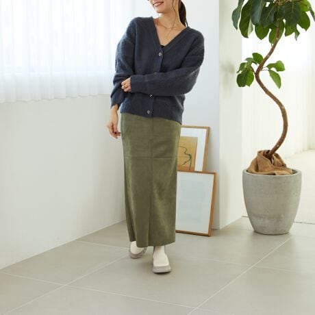 秋冬のスタイリングにマストな定番カーディガンは、輪っかに引っ掛けて止めるゴールドのマンテルボタンをあしらったデザインでこなれた着こなしに。