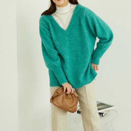 深めのVネックなのでインナーアイテムで雰囲気が変わり、レイヤードコーデなど、幅広いスタイリングが楽しめる使い勝手抜群のアイテム。