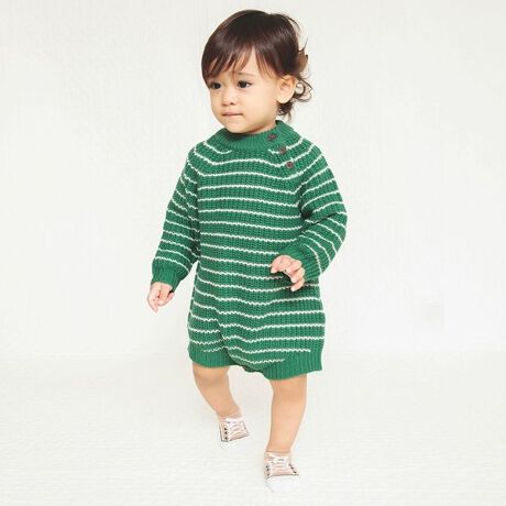 ざっくりした編地が特徴のボーダーニット長袖カバーオールは