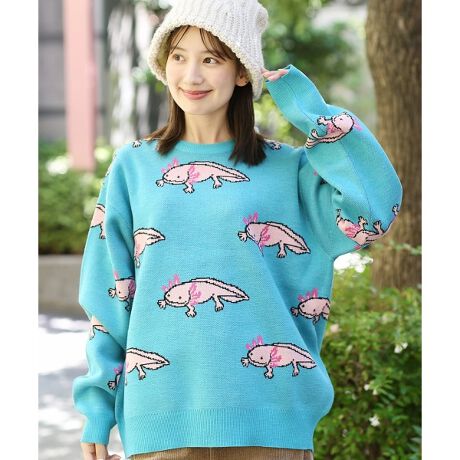 メキシコ原産のウーパールーパーを全面に散りばめた他にはないデザインのジャカードニット。