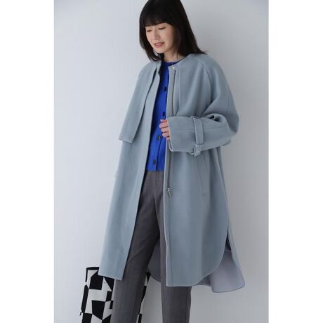 デザイン性があり羽織るだけでコーディネートが様になるコートです。前後差のあるラウンドしたヘムラインが動きのあるデザインなので、細身のボトムと合わせるとすっきりとしたスタイリングになりおすすめです。