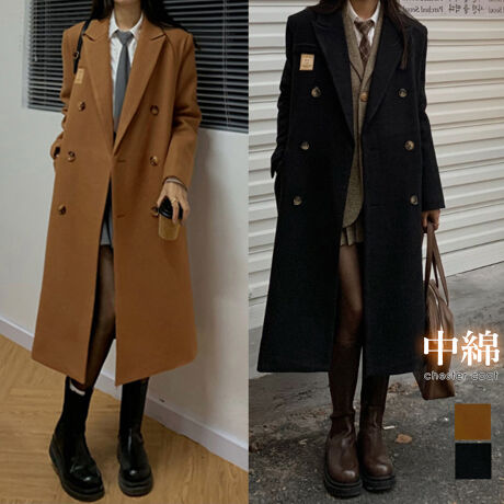 大きめの襟とダブルボタンのデザインがクラシカルな雰囲気を醸し出すオーバーサイズチェスターコートの