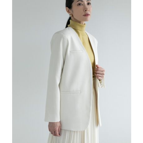 アクセサリーやインナーと合せやすいシンプルで上品なノーカラージャケット。