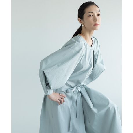 ゆったりとしたシルエットが特徴のワンピース。腰に付いた紐でウエストマークして綺麗なシルエットに。柔らかく肌触りの良い綿とリヨセルの混紡素材を使用。