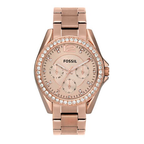 45個のストーンをトップリングにあしらったアイコニックなRYLEYのスタイルに、ローズゴールドトーン仕上げと質感のあるローズダイヤルを組み合わせました。マルチファンクションムーブメントを搭載しています。