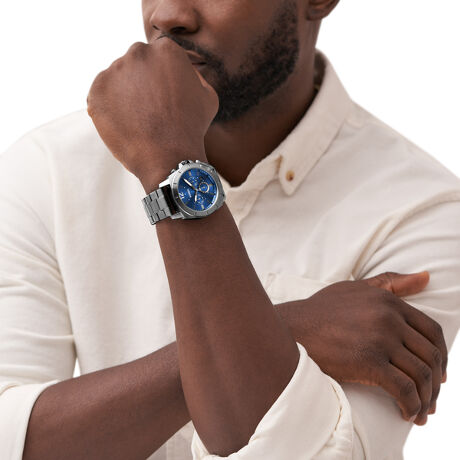 45mm径のケースにクロノグラフムーブメントを搭載したPRIVATEER。ブルーのサンレイダイヤルに、スモークのステンレススチールブレスレットを組み合わせました。