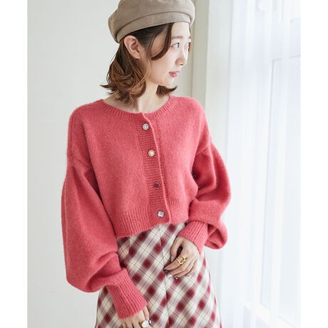 きらきら輝くビジューボタンと心躍るカラーが魅力のニットカーディガン。