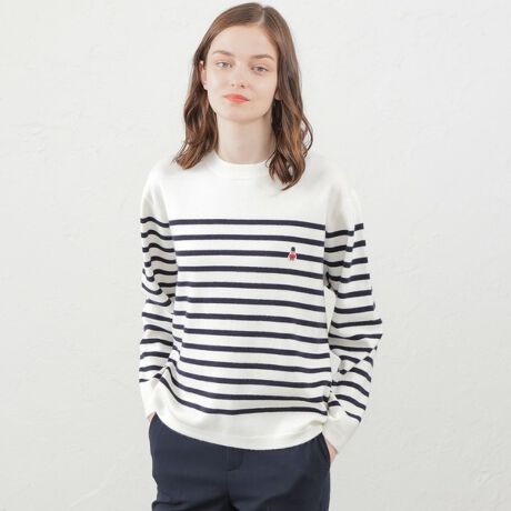 バッキンガムベアのワンポイントワッペンが目を惹くボーダーニット。肩や裾は無地、中央のみにボーダーを入れたパネルボーダーでアクセントのあるデザインにしております。