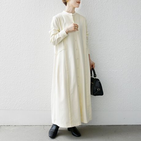 スタンドカラーがマニッシュな印象のロングシャツワンピース。