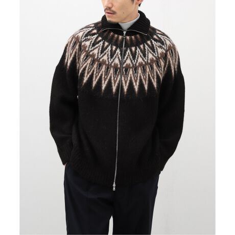 ネックを高めに設定したノルディック柄のドライバーズニット。