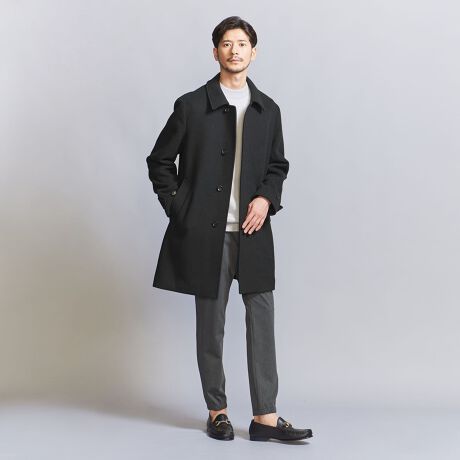 メンズコートの代表格のバルカラーコートはセットアップのアウターとしてもジーンズでも違和感なく決まる守備範囲の広さも特徴です。