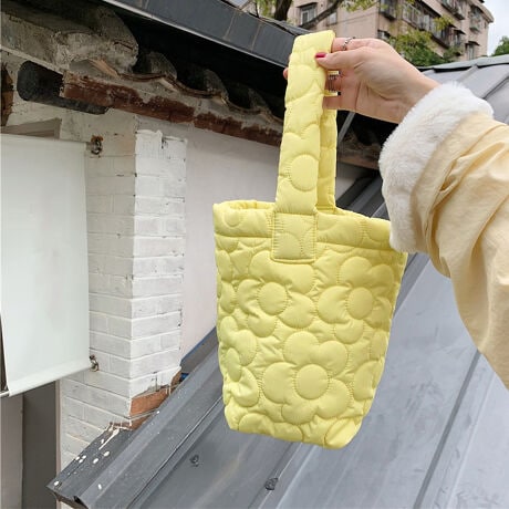 ふんわり柔らかく軽いキルティング生地に花柄ステッチを加えたオトナガーリーなパステルカラートートバッグ