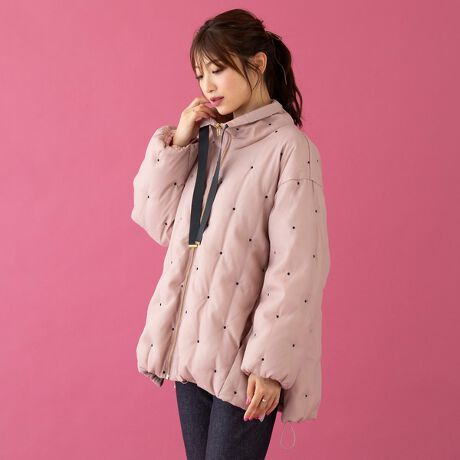 ドット刺繍のチュールを重ねた個性的なデザインのダウンコート。