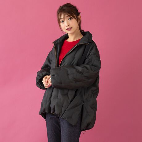 デザインがただただかわいいです!またとても軽いダウンで、サイズはゆったりめです。