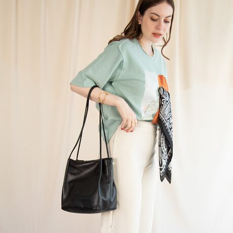 柔らかいPUレザーと内側に映えるカラーを合わせたボックス型トート。