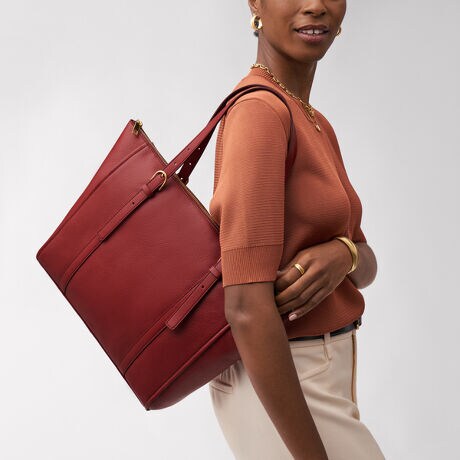 ファスナーポケット1つ、スライドポケット2つ、マグネットスナップ付きフロントスライドポケット1つを備えたLiteHideレザー製トートです。調節可能なハンドル2本が付いています。Fossilのレザー製品は、Leather Working Group(LWG)を通じて責任あるものづくりを支援しています。