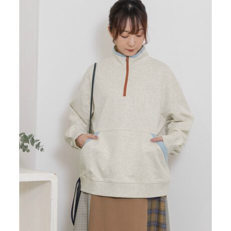 ・衿ぐりとポケット口のパイピングカラーがアクセント。ハーフジップのファスナーも配色になっていて着ていて楽しいアイテムになっています◎