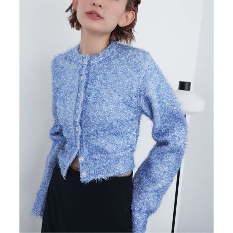 ポリエステルの毛足のあるラメ素材のニットカーディガン。