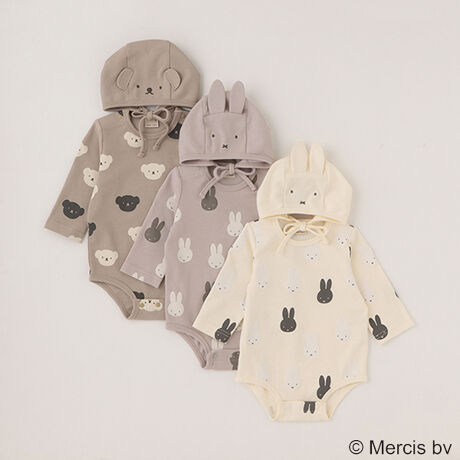 ベビーのお出かけスタイルがキュートに決まるロンパースと帽子のセットです。アイボリーとライトピンクはミッフィー、ライトグレーはボリスをデザインしました。脚をばたつかせる時期から活躍する股留めタイプ。おうち時間にもお外用にもおすすめのアイテムです。【おすすめの着用時期は秋冬シーズン】【透け感】透けない※アイボリーはやや透ける【生地の厚さ】普通【伸縮性】あり【裏地】なし【ポケット】なし